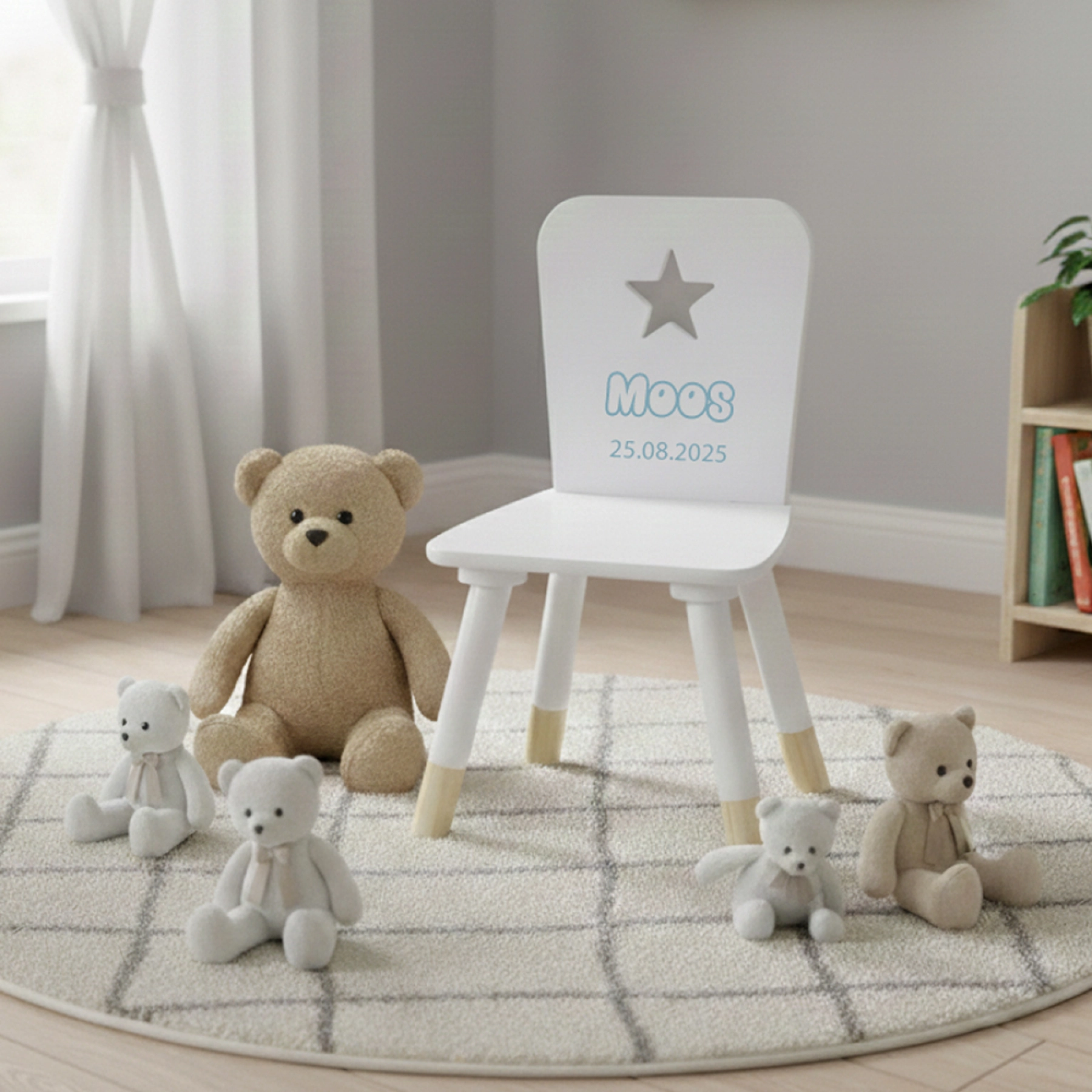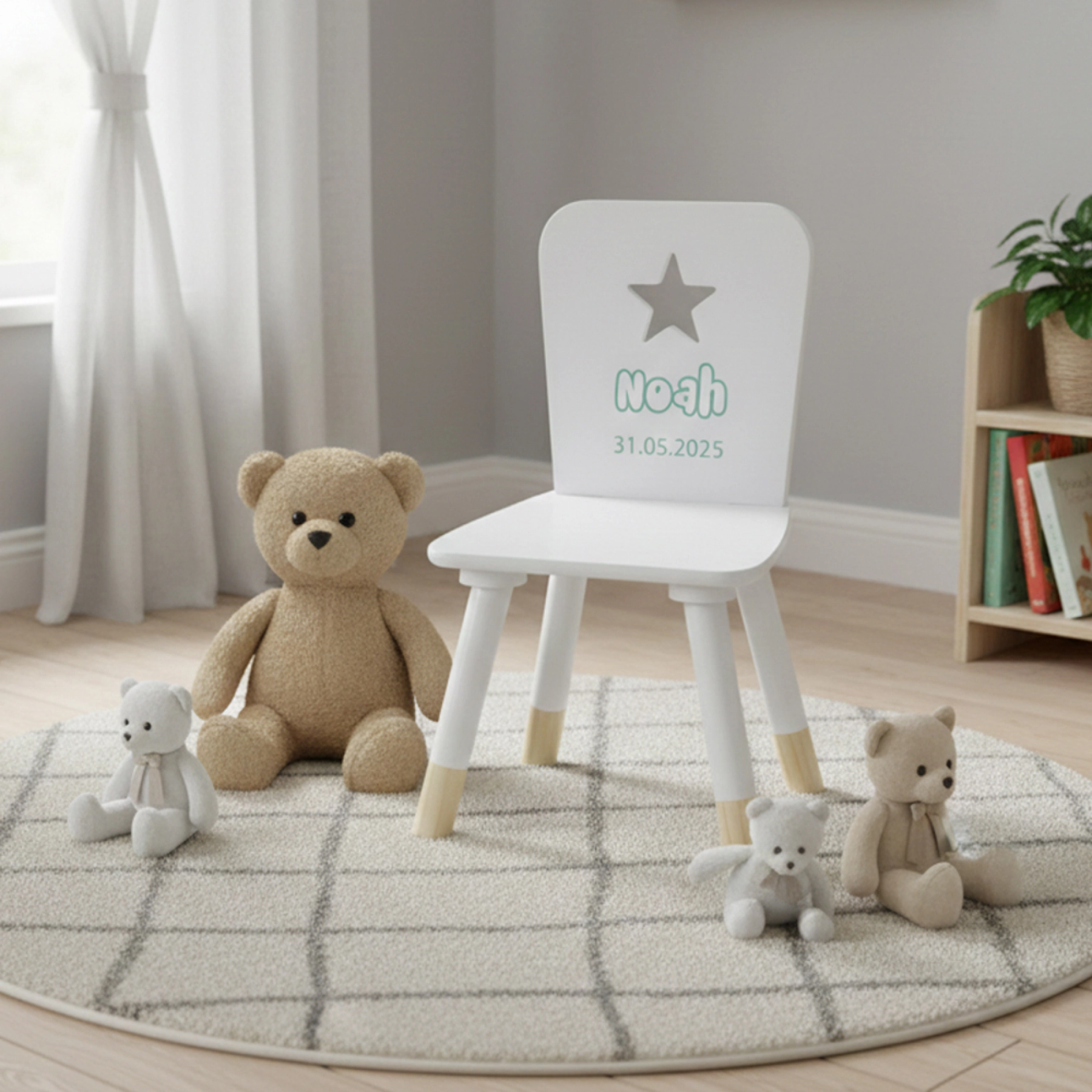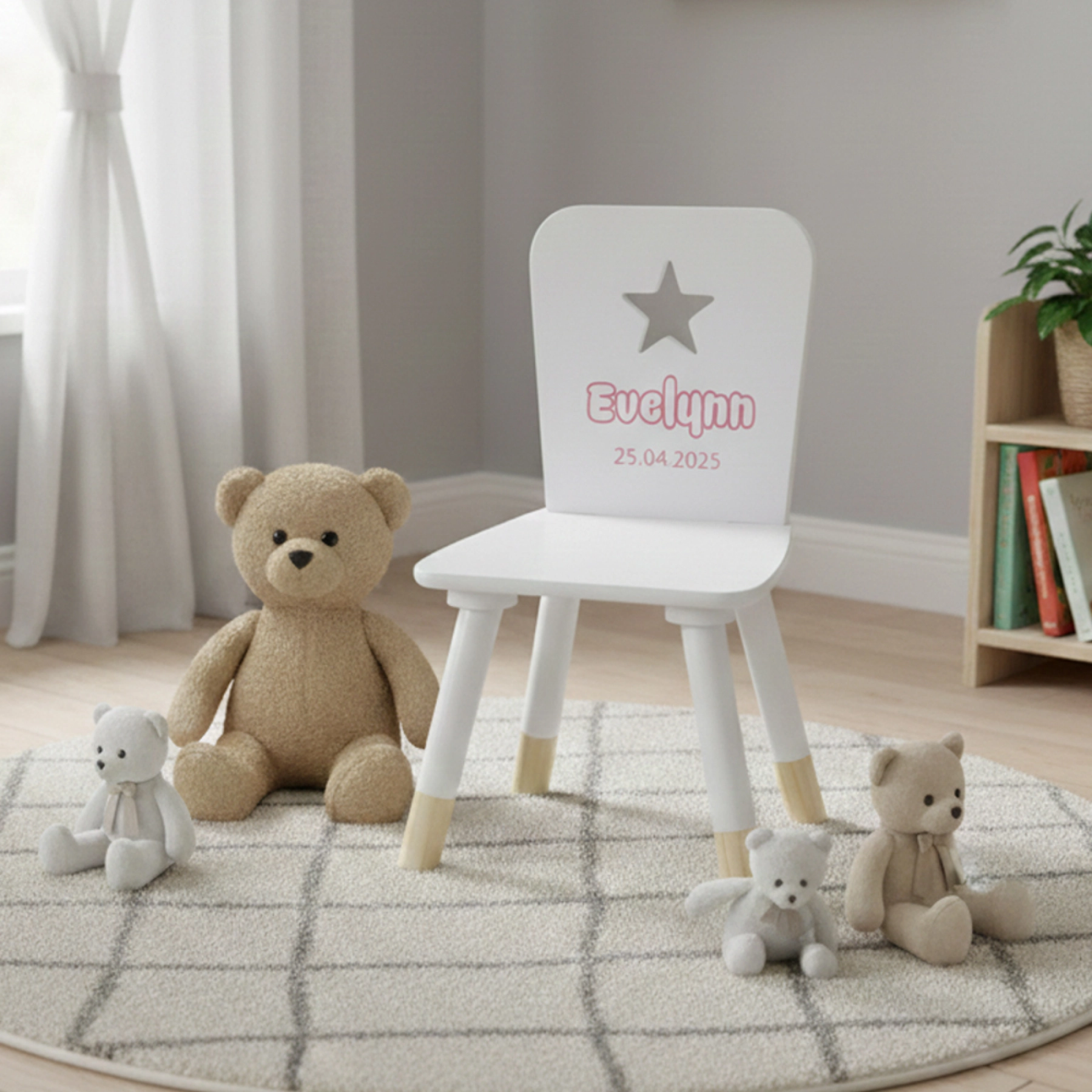 Ieder kindje verdient een eigen stoeltje en wat is er dan leuker dan een stoeltje met eigen naam en datum op de rugleuning. Maak het setje compleet met een bijpassend tafeltje.