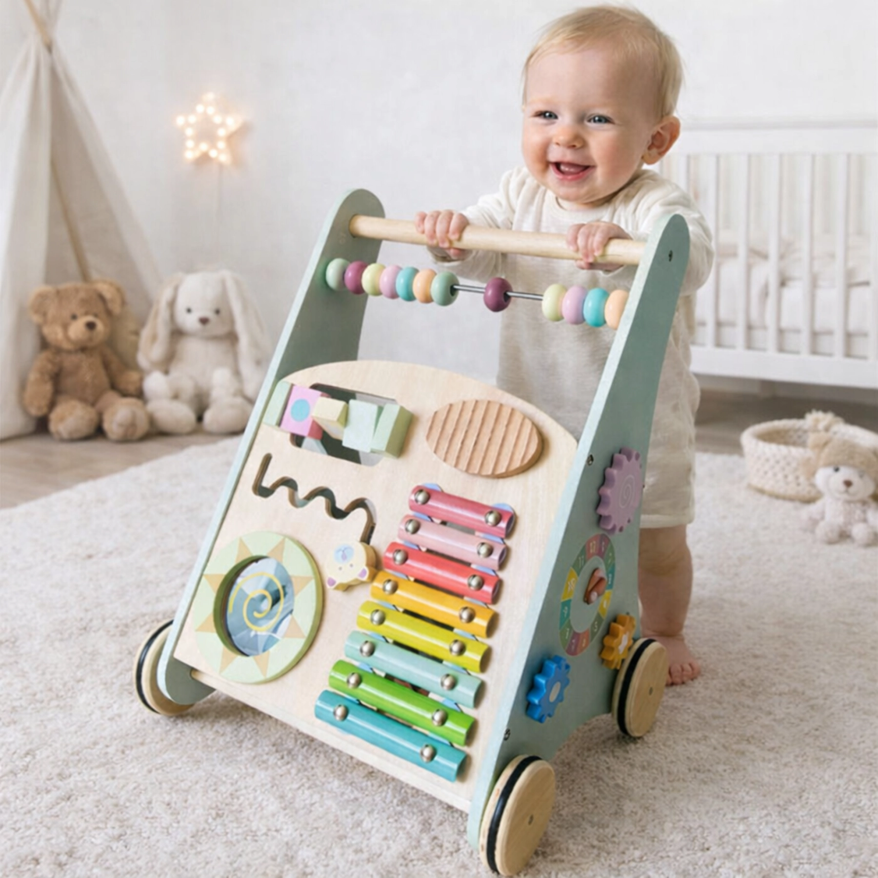 Geef je kleintje het perfecte steuntje bij de eerste stapjes en uren speelplezier met deze houten loopwagen vol educatieve activiteiten!Deze stijlvolle, pastelkleurige loopwagen is veel meer dan een loopkar: het is een mini-speelwereld op wielen. Ontworpen om de motoriek, zintuigen en creativiteit van je kindje te stimuleren, veilig en verantwoord. Multifunctioneel ontwerp: bevat o.a. een xylofoon, draaiwielen, vormenstoof, kralenframe en tandwielen. Stimuleert ontwikkeling: bevordert de fijne motoriek, kleur- en vormherkenning en muzikaliteit. Veilig en stevig: gemaakt van hoogwaardig hout met zachte randen en stabiele wielen. Inclusief accessoires: vormpjes en stokjes voor het xylofoonspel zijn inbegrepen.
